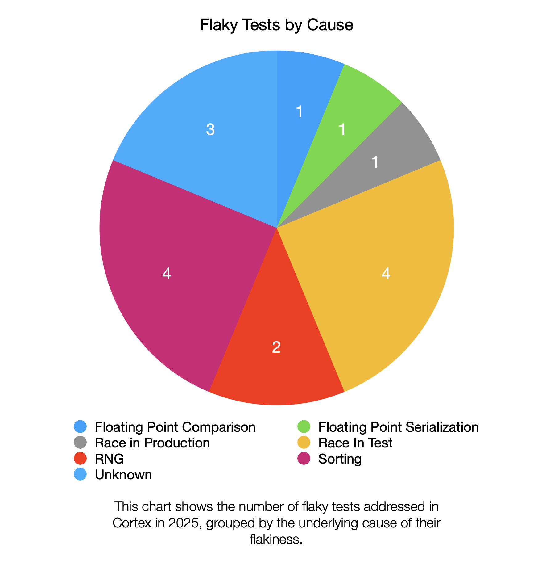 Of the 16 tests addressed in 2025, the underlying cause of the flaky behavior can be broken down into several categories: