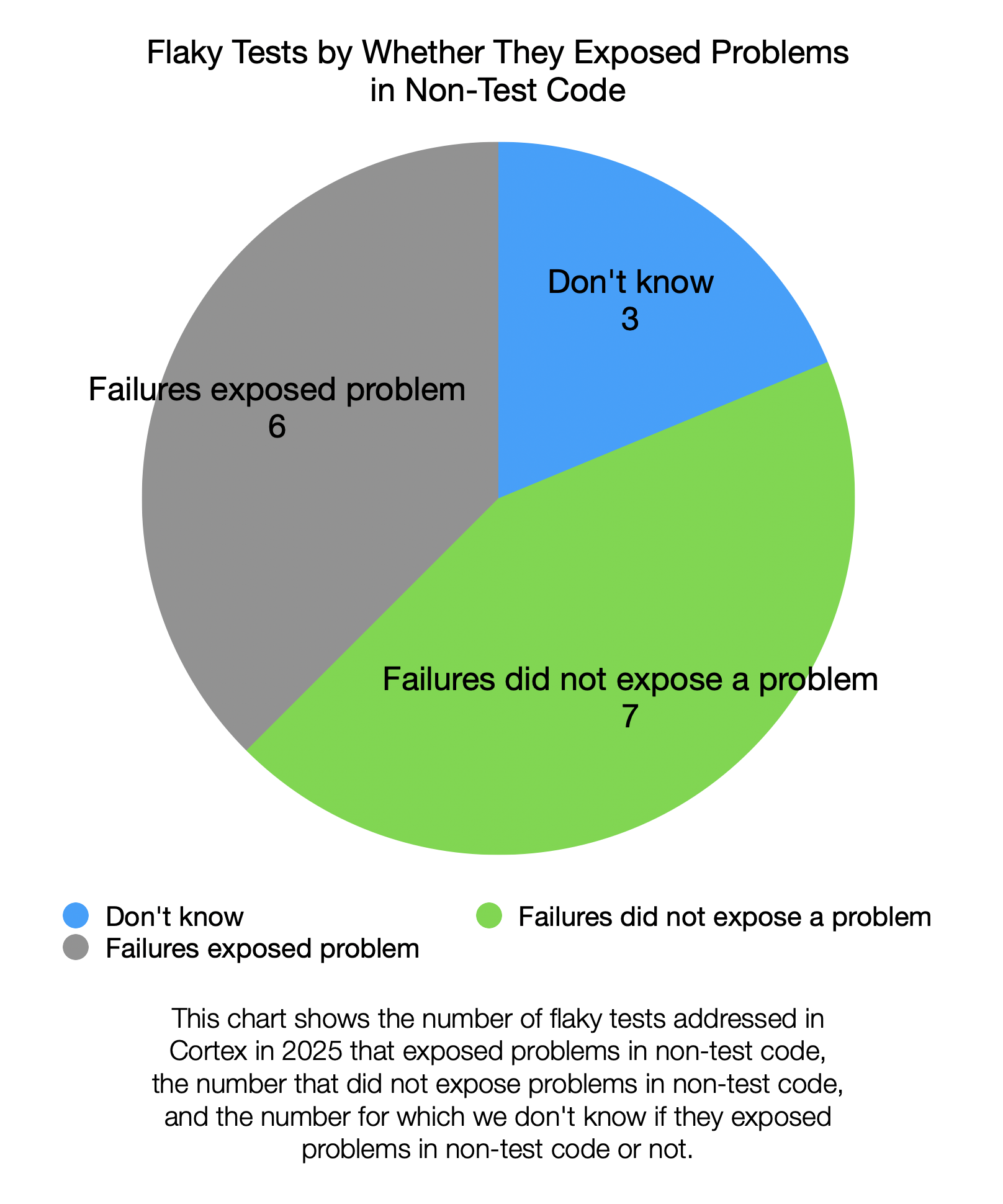 Of the 16 flaky tests addressed in 2025, many of them were caused by problems in test code. However, a similar number of tests exposed problems in non-test code: problems that could happen in production. A full breakdown is below: